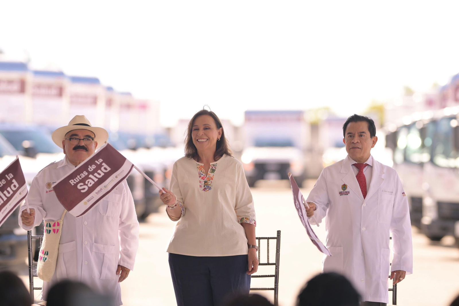 En el enlace desde Veracruz, la gobernadora Rocío Nahle García informó que en el estado se desplegarán 29 unidades que recorrerán los 212 municipios, llevando insumos a 816 centros de salud y a más de 60 hospitales, entre ellos cuatro oncológicos.