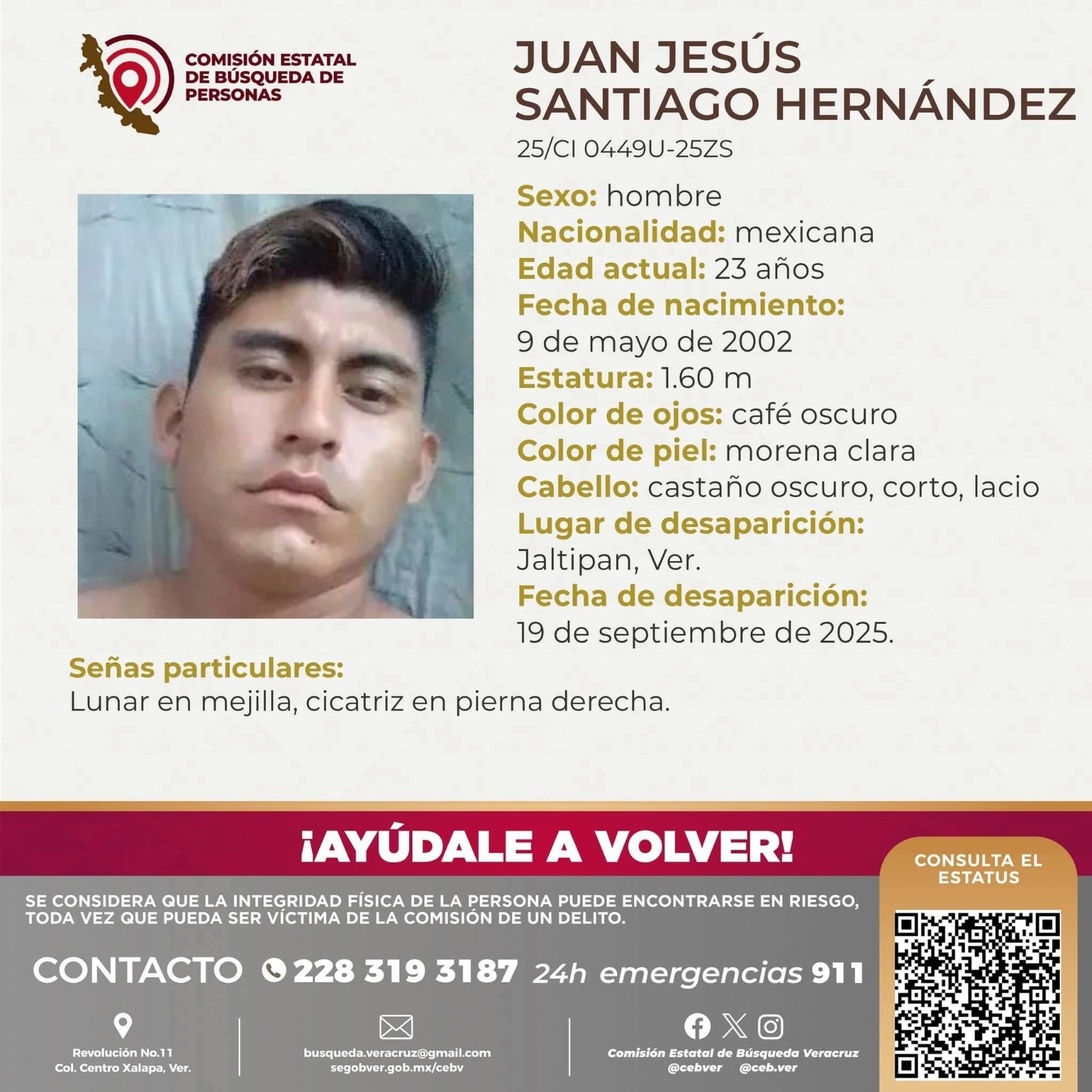 • Juan Jesús Santiago Hernández, de 23 años, visto por última vez el 19 de septiembre de 2025. Mide 1.60 metros, de piel morena clara, ojos café oscuro y cabello castaño oscuro, corto y lacio. Como señas particulares presenta un lunar en la mejilla y una cicatriz en la pierna derecha.