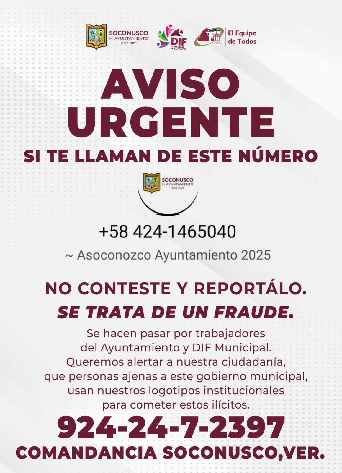 Ante el incremento de reportes ciudadanos, el Ayuntamiento de Soconusco emitió un comunicado urgente para advertir a la población sobre llamadas provenientes del número +58 424 146 5040, las cuales corresponden a presuntos estafadores que intentan obtener información personal o dinero mediante engaños.